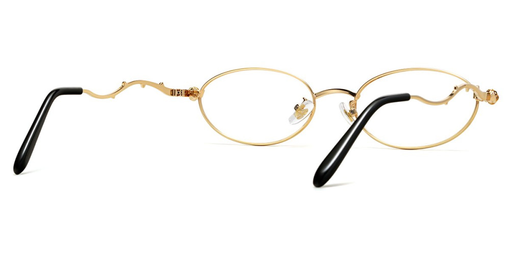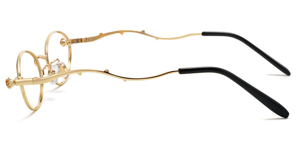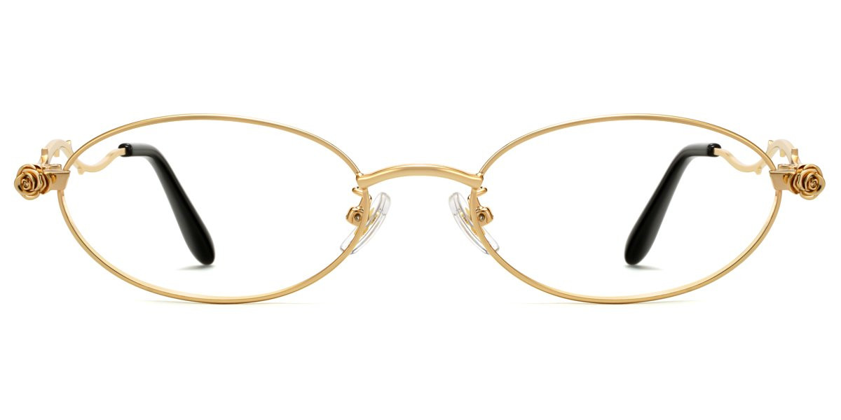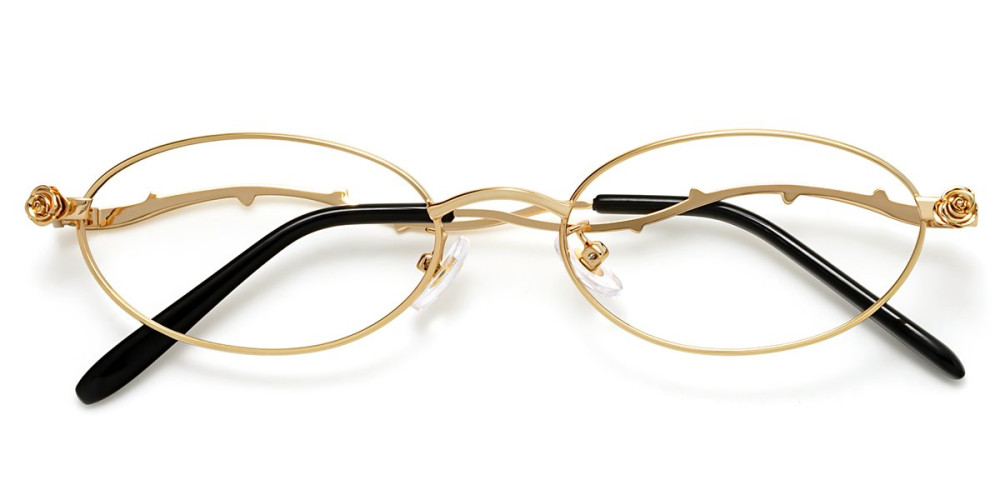 These glasses have a delicate gold oval frame. The oval shape is timeless and flattering. The little rose details on the frame add a touch of elegance and romance, making them a sophisticated choice that can elevate any outfit.