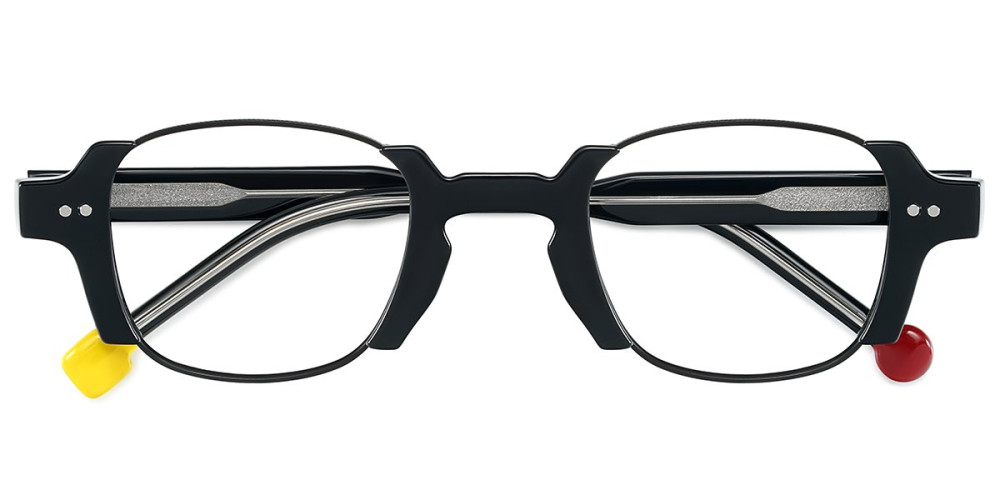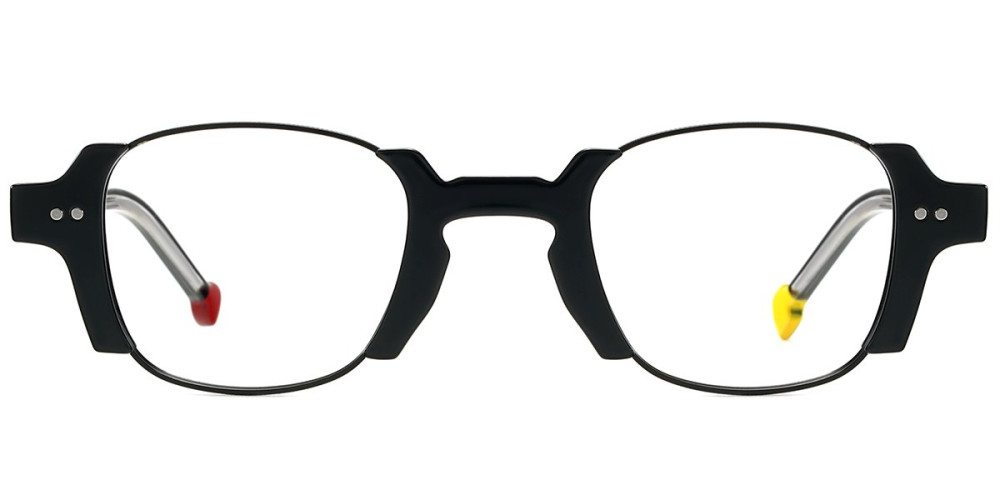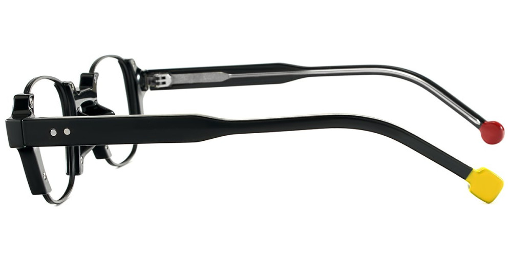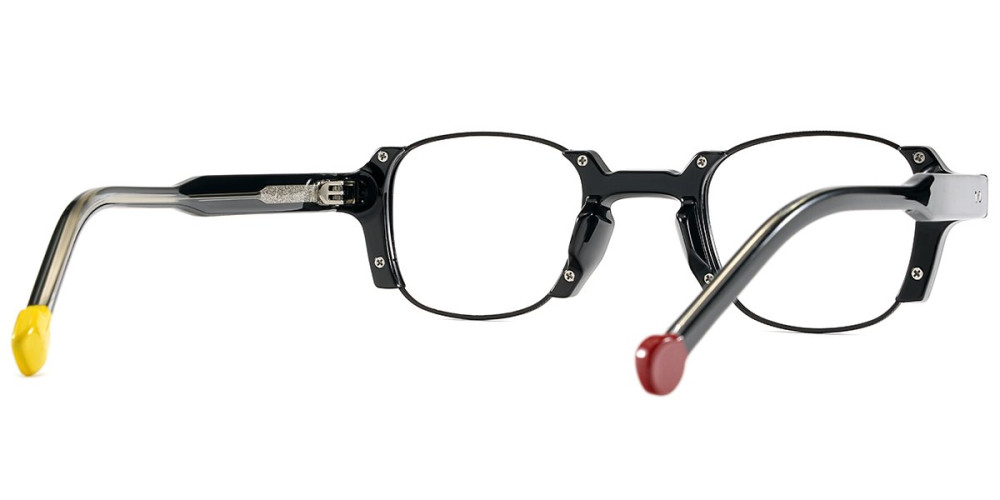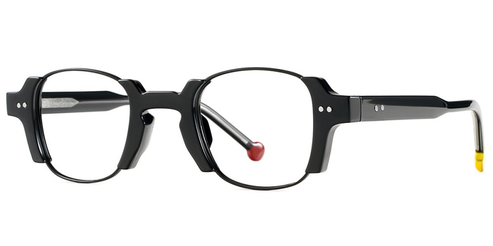 These glasses have a really unique look. The shape is a mix of clean lines and simple geometric forms. The bridge and the front part look like they’re made with a kind of architectural style, and there are little circular details that make them look more polished.