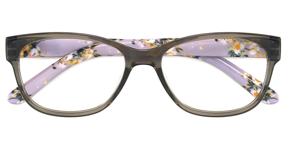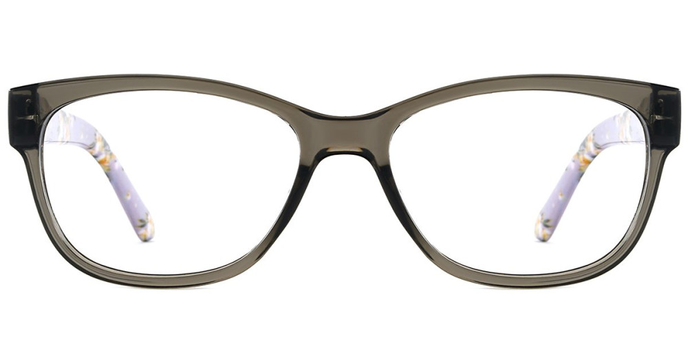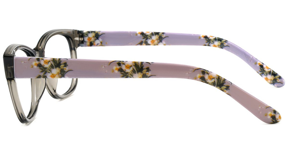 These frames have a chic, floral - patterned temples. The main frame has a smooth, simple shape, while the arms bring in a delicate, nature - inspired print. It's a great blend of understated front design with a decorative, eye - catching detail on the sides.