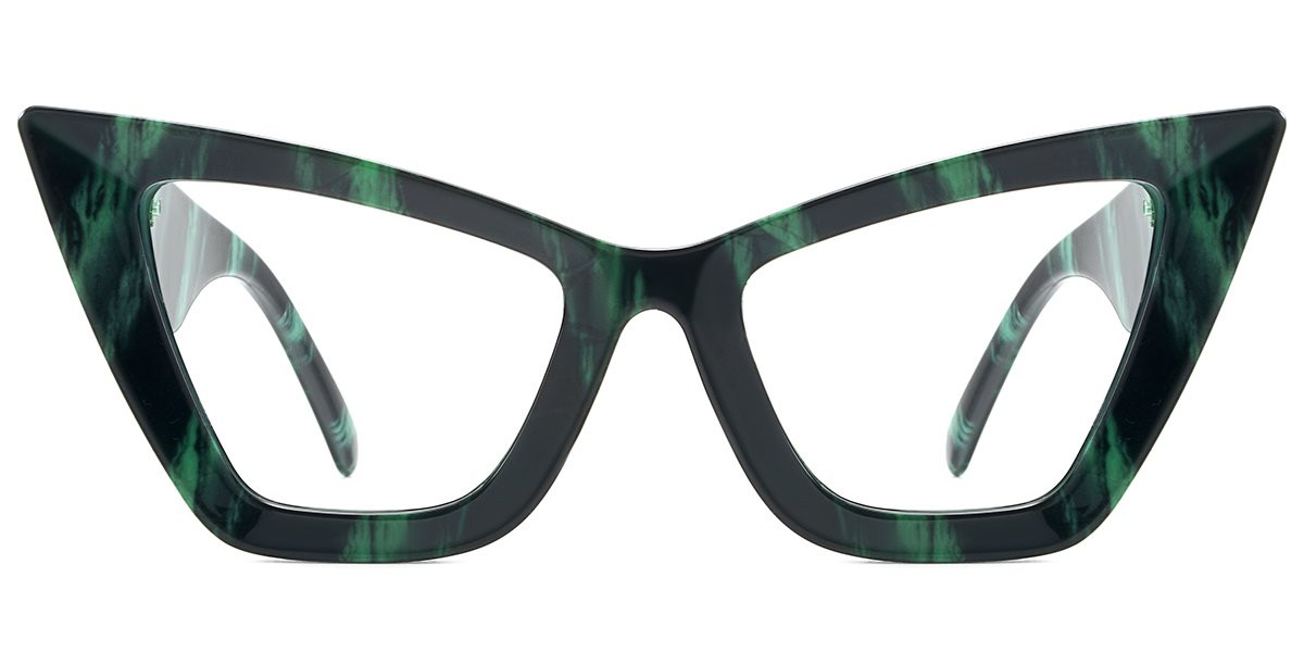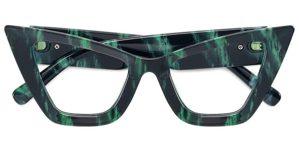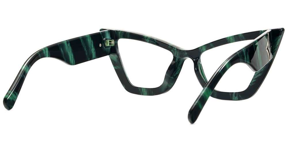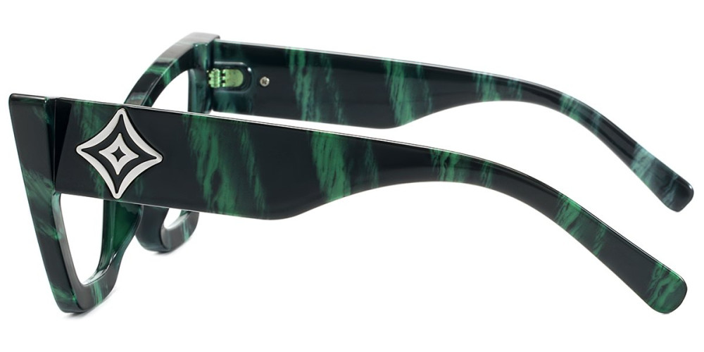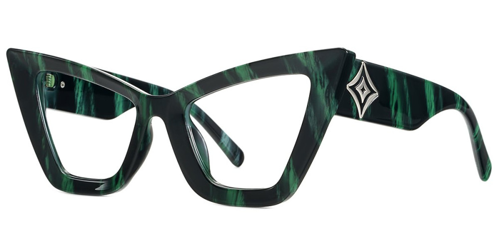 A striking cat-eye frame with a deep marbled finish that gives off a confident, mysterious vibe. The wide temples and metallic accent add a touch of luxury, making it a perfect statement piece for any look.