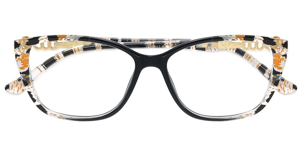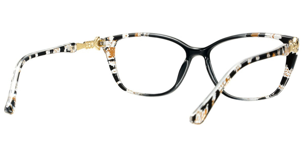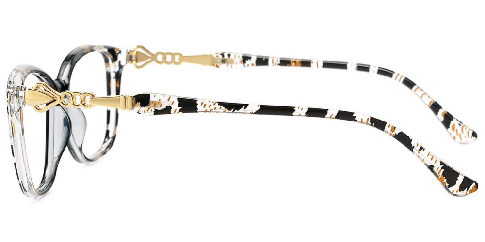 These frames have a stylish pattern on the frame front and temples. The design is enhanced by elegant gold - toned accents on the temples, giving them a chic and fashionable look that combines classic and trendy elements.
