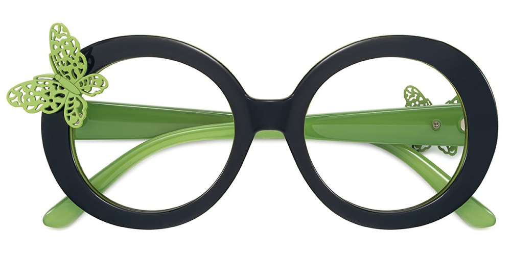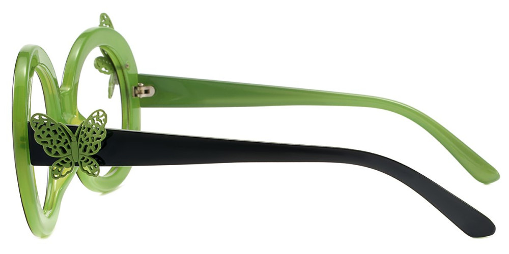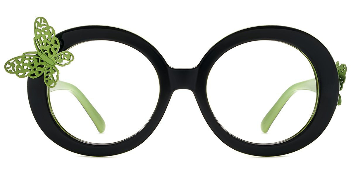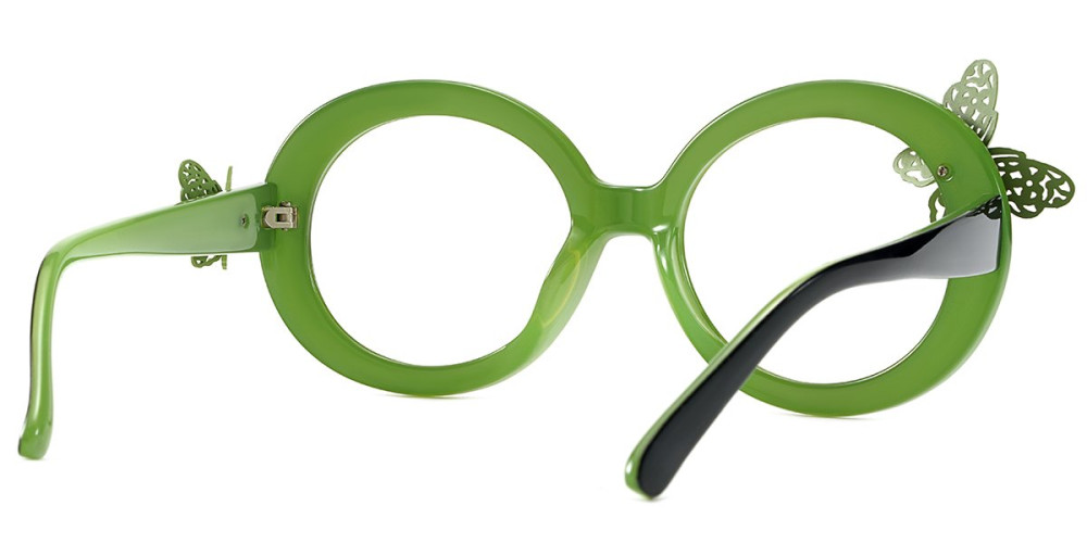 These eyeglass frames have a lovely round shape that brings a vintage feel. What makes them special is the delicate butterfly details on the sides—they look like tiny, pretty butterflies resting on the frames, adding a really cute and whimsical touch to your style.